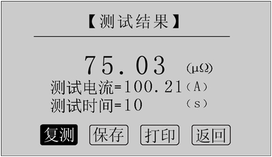 在主界面中選中“開(kāi)始測(cè)試”項(xiàng),點(diǎn)擊鼠標(biāo),儀器進(jìn)入測(cè)試菜單界面,認(rèn)測(cè)試電流為100A,測(cè)試時(shí)間為10s