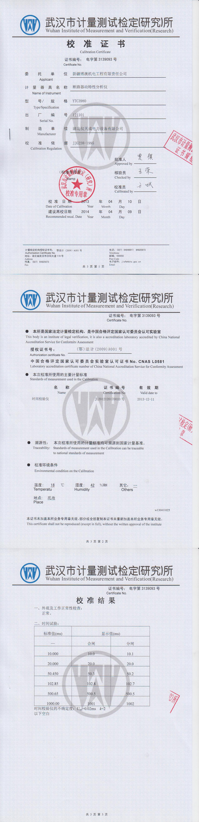 轉(zhuǎn)載:"YTC3980斷路器動特性分析儀資質(zhì)證書" 請注明來源于儀天成電力。 更多技術(shù)問題請致電儀天成電力客戶服務(wù):027-87876585,技術(shù)部專線:027-87876585,在線客服:719388481