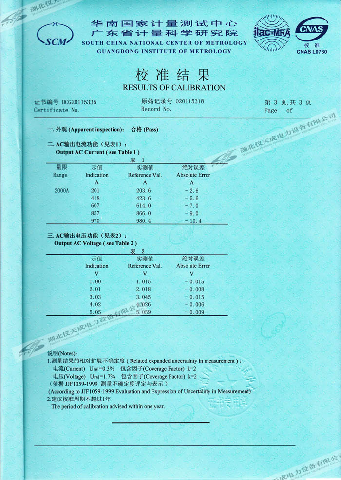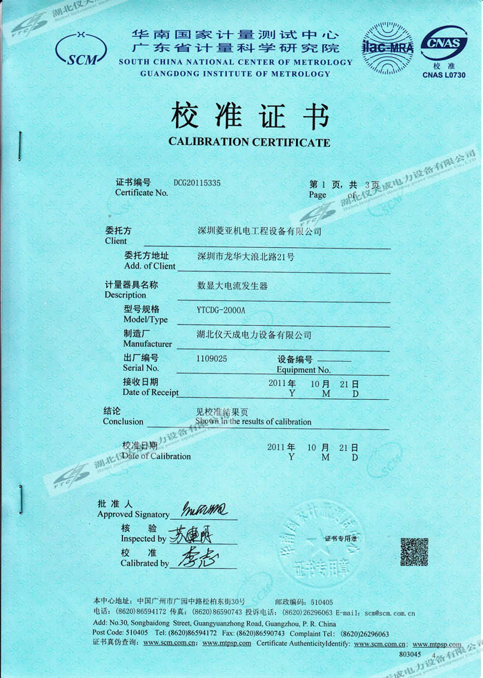 YTCDG-2000A大電流發(fā)生器的資質(zhì)證書(shū)